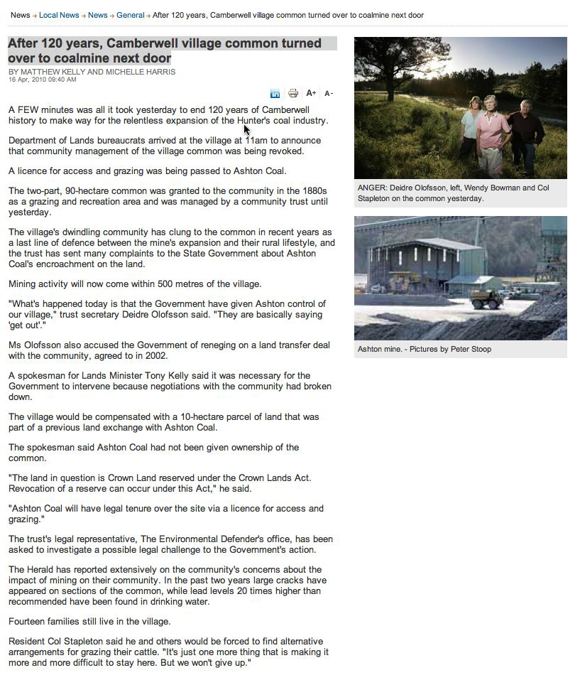 | After 120 years, Camberwell village common turned over to coalmine next door BY MATTHEW KELLY AND MICHELLE HARRIS 16 Apr, 2010 |