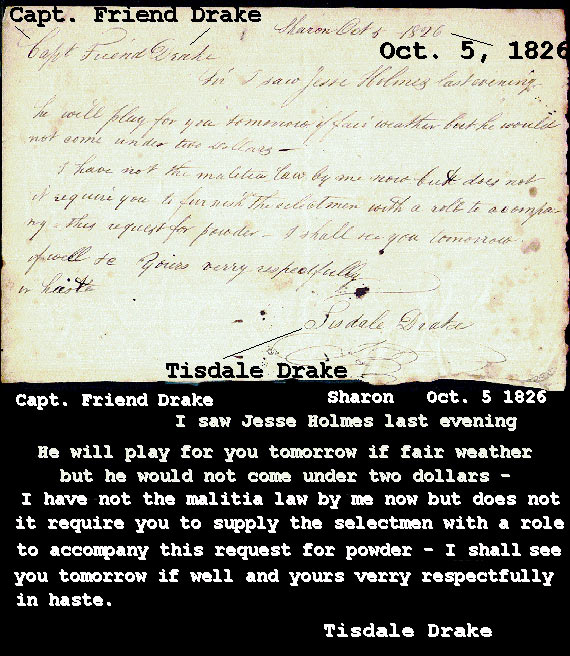 New England Drakes (I am from the 17th century Virginia lines). It also is interesting that the musician is to travel Sharon, PA and play at some community or military station not far away. Our PA money of 1820 would be equal to about 45 times that sum today, hence this entertainer was asking about $90.00-$100.00 American for his performance. Do with this pic as you choose, or not atall; I will not be offended if the latter is your choice. Do have a nice day. Later. Warmly,